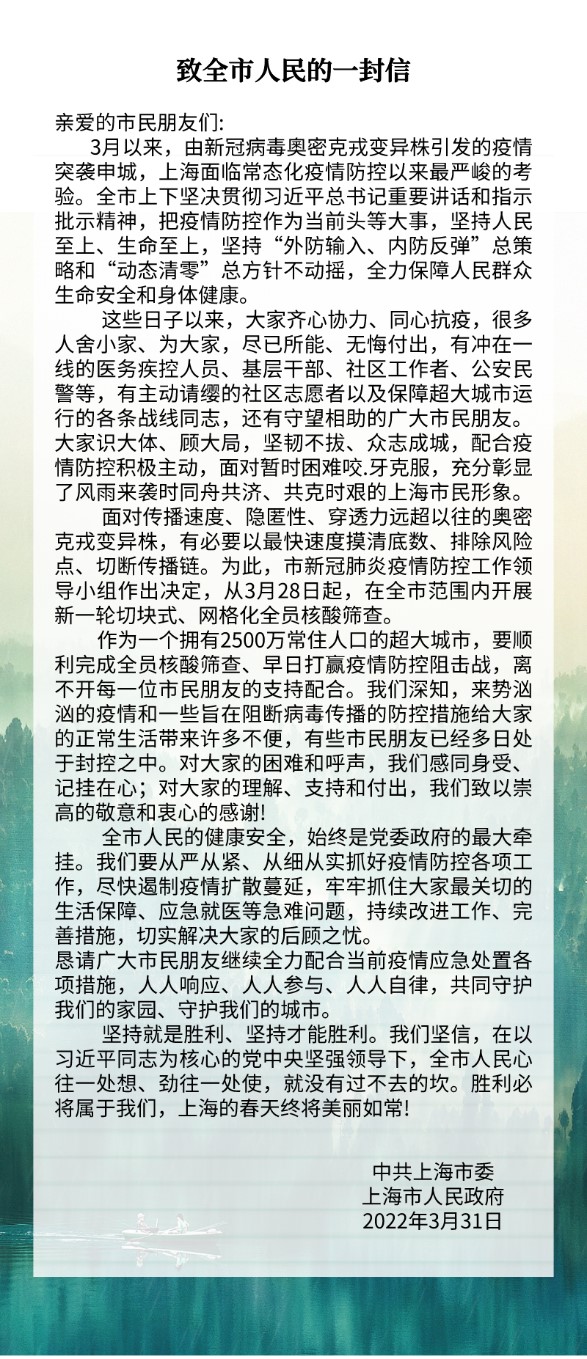 3月31日,上海市委市政府發(fā)布了《致全市人民的一封信》。希望上海軟件中心全體職工一如既往全力配合當前疫情應急處置各項措施,在自身條件允許的前提下積極參與志愿服務(wù)。讓我們一起同舟共濟、共克時(shí)艱,一同打贏(yíng)這場(chǎng)疫情阻擊戰。